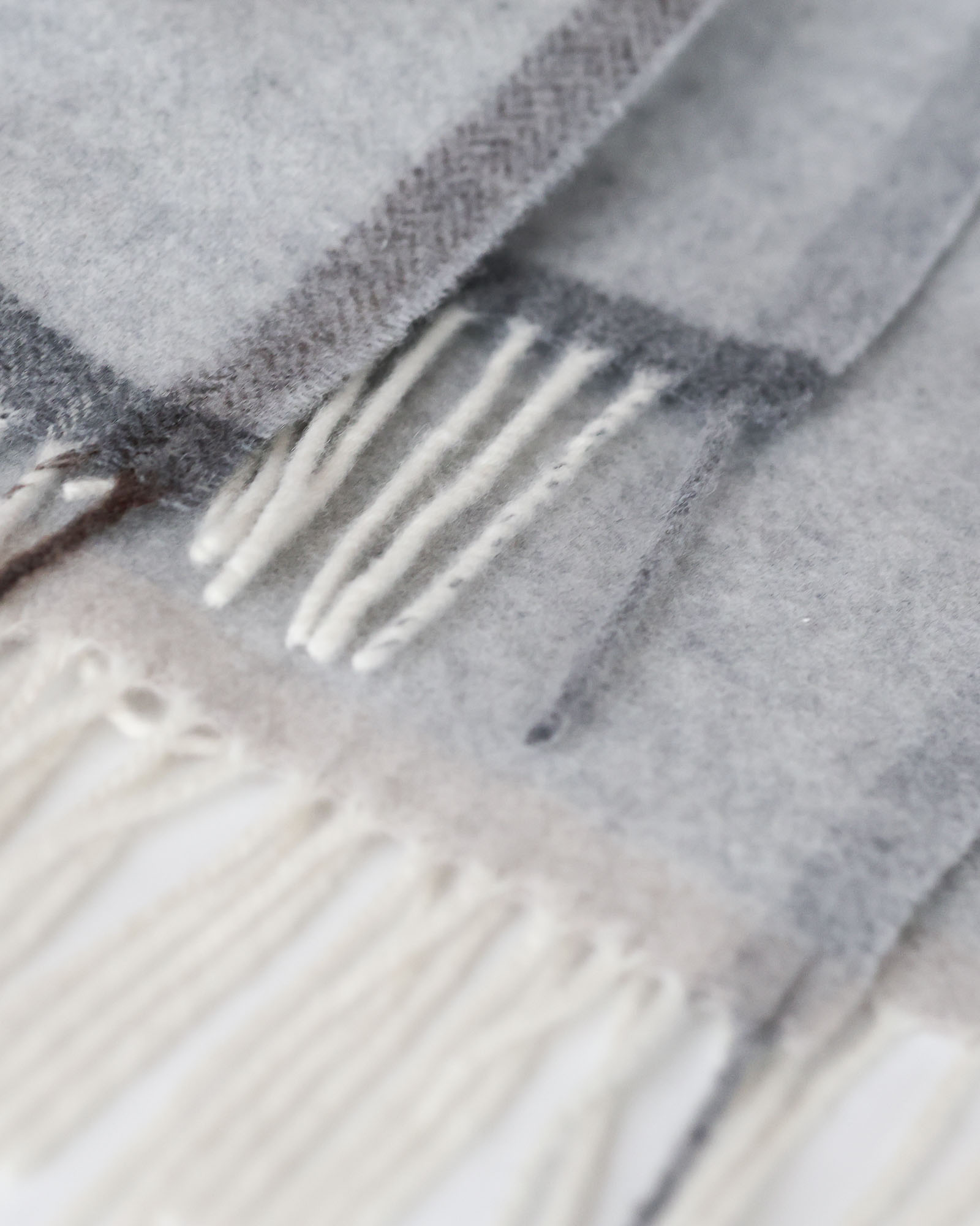 Een fijn visgraatpatroon in een lichtgrijze tint. Deze plaid is zijdezacht en licht in gewicht.